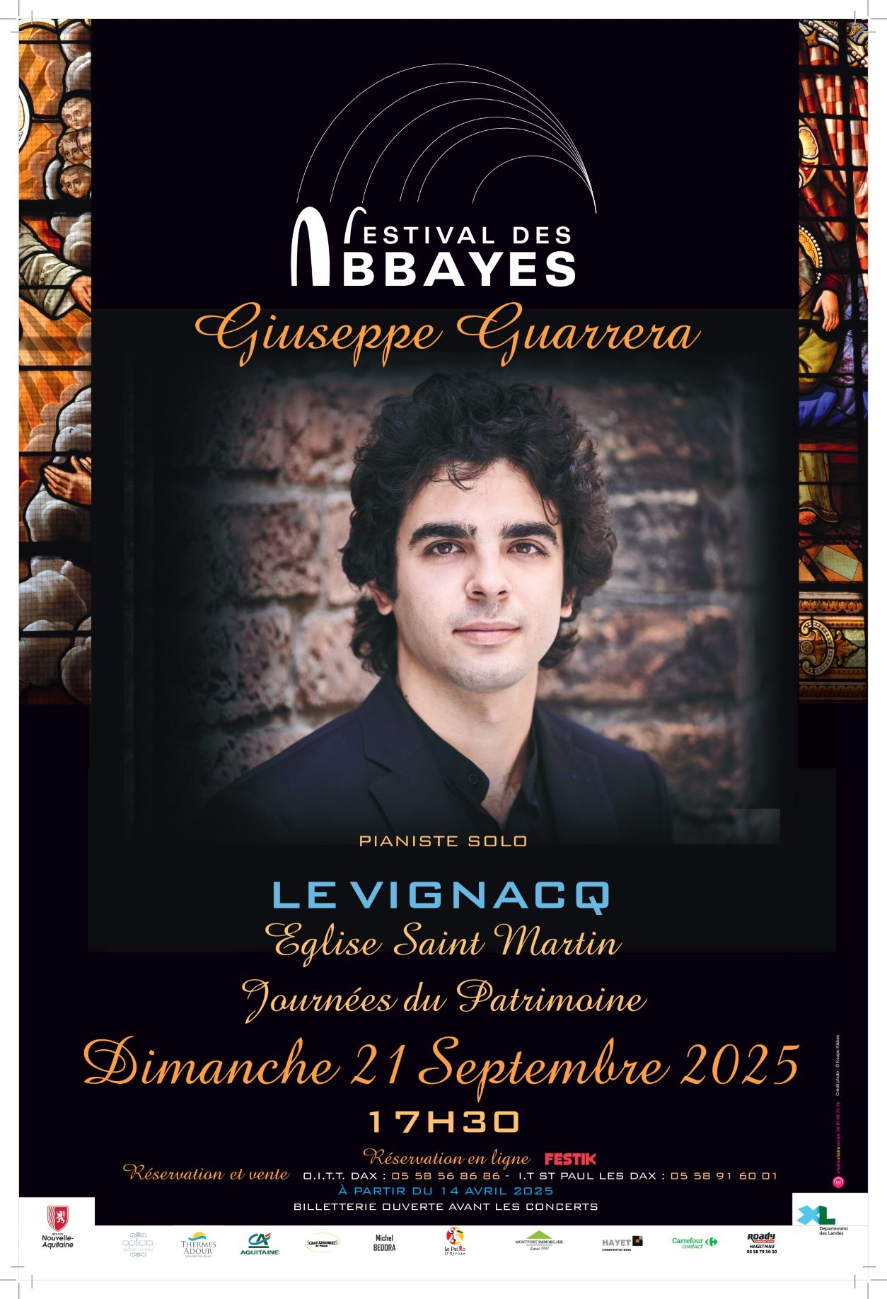 Festival des Abbayes LEVIGNACQ Publié le 05 juin 2023 / Dernière modification le 28 août 2025 Festival des Abbayes LEVIGNACQ Publié le 05/06/2023 - Dernière modification le 28/08/2025 Clôture Festival des Abbaye Journée du Patrimoine Giuseppe Guarrera Pianiste Solo Église Saint Martin