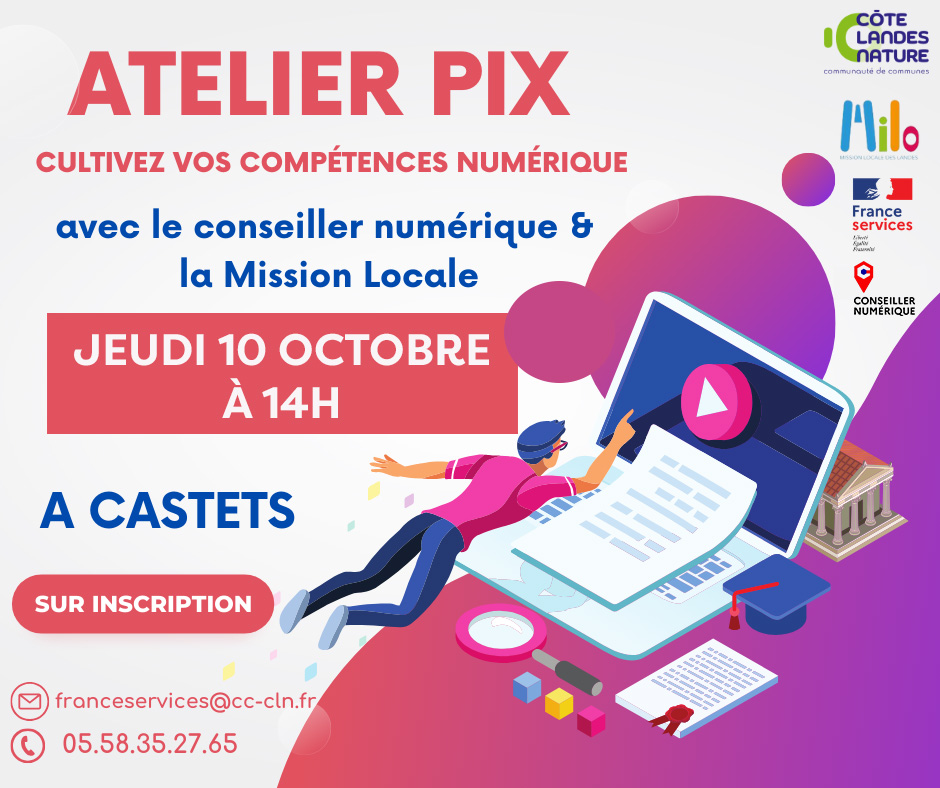 - Atelier PIX : le jeudi 10 octobre à 14h à l'Espace France Services de Castets