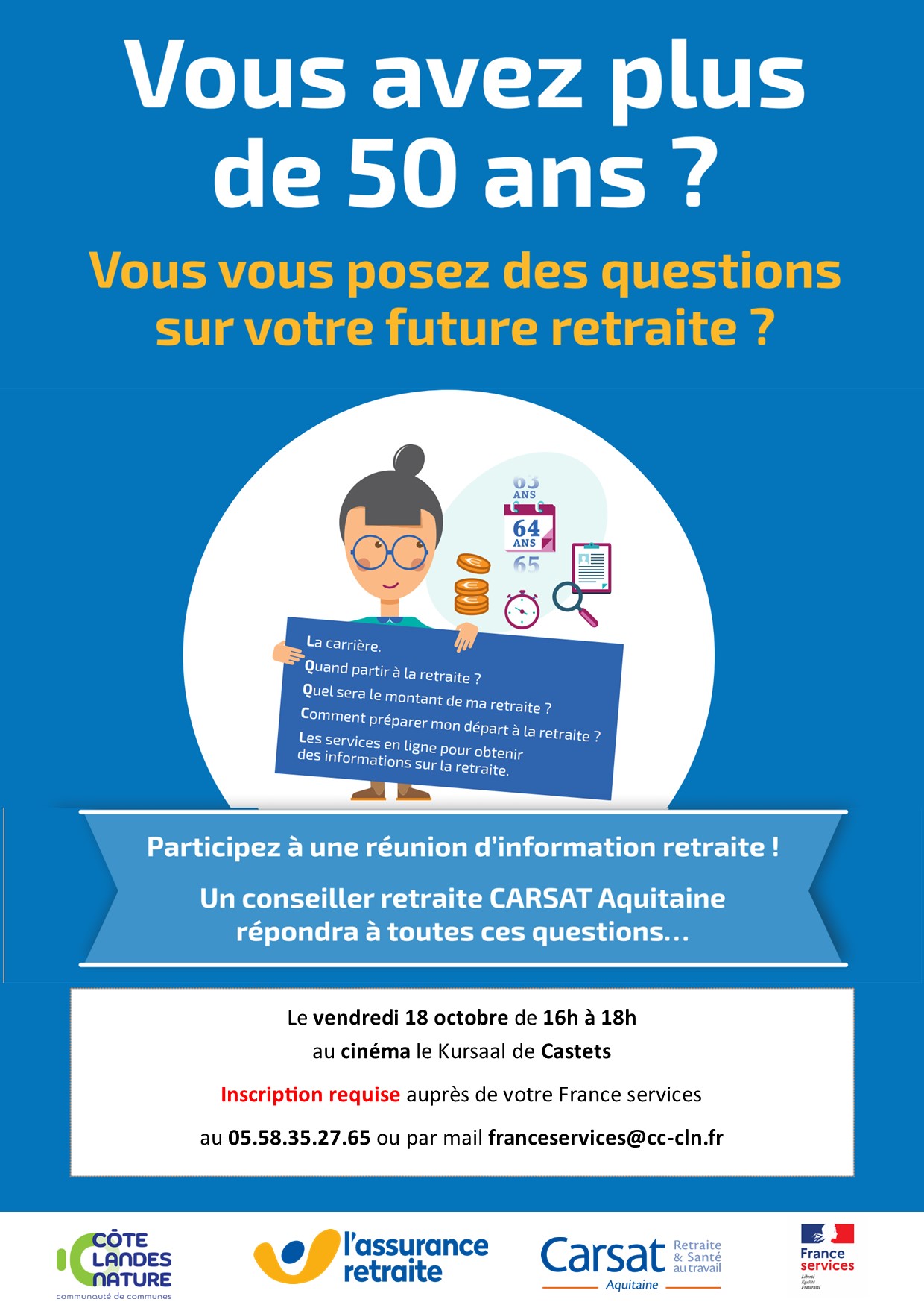 - Réunion d'information retraite : le vendredi 18 octobre à 16h au cinéma le Kursaal à Castets