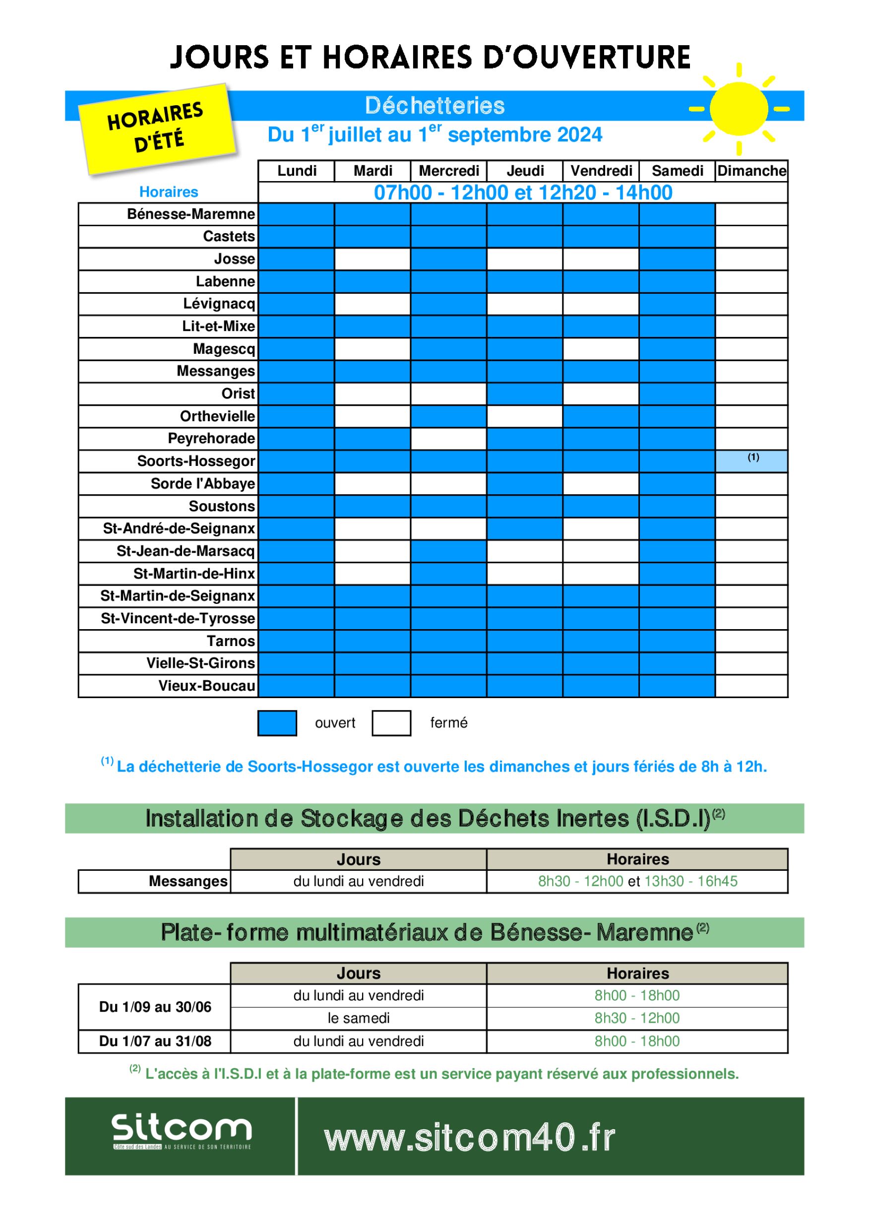 Afin de répondre aux enjeux des agents du Sitcom et de qualité de service rendu aux usagers face à des épisodes caniculaires de plus en plus fréquents, le Sitcom Côte sud des Landes a décidé de modifier, durant la période estivale les horaires d'ouverture de ses déchetteries.